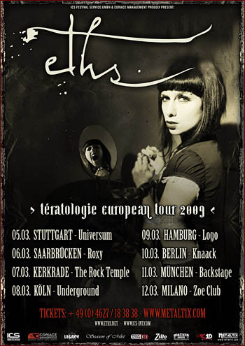 Après un temps assez long nécessaire à la mise en place des instruments et à leur accordement. ETHS monte sur scène. Ils commencent tout de suite par « Samantha » et « Crucifère », histoire de nous mettre dans le bain. Le public en voulait, ils en ont eu. On redoute un peu que l'ambiance des albums ne soit pas la même dans un live. Il est vrai que l'atmosphère de leur musique est assez particulière. Que les fans soit rassurés, ETHS conserve bien cette marque de fabrique qui leur est si particulière. La voix hurlée de la belle Candice nous plonge dans ce mélange d'amertume et de violence qui donne toute la force de groupe. Les pogos se font très ponctuels et assez mouvementés. La pression monte assez vite parmi le public. Un petit « Ileùs Matricis » pour calmer un peu tout ça. Et parallèlement, des petits effets supplémentaires sont rajoutés, comme de l'orgue pendant « Tératologie » et une guitare (Greg et Staif) aux sons modifiés beaucoup plus présente qui rajoute un effet un peu plus aérien. ETHS a toujours la même hargne tout en gardant ce côté de proximité avec le public. Discutant deux trois mots avec les fans ou poser en photo. Candice a ce côté provocateur qui met le feu aux métaleux de genre masculin. Et malheureusement cela lui portera préjudice cette fois ci. N'ayant pas de gorille pour séparer les fans des membres du groupe, elle devra demander d'arrêter à une personne de la toucher. Une parole criée (propos fasciste il me semble) a faillit tourner en baston quand le deuxième guitariste voulu donner une bonne raclée au mec en question. Forte heureusement Candice calma tout le monde. Sûrement à cause de cela, le groupe quitta un peu vite la scène. Même pas une heure de show, beaucoup trop court, et pas de bis. On sort un peu dégouté. Et c'est vraiment dommage! (6/10)