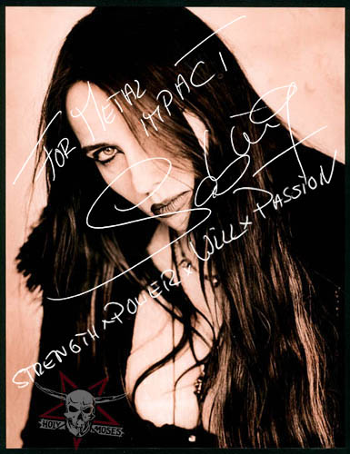 Sabina. Eh bien, le groupe a été fondé en 1980. Je suis arrivé dans le groupe en 1981, c'était en fait notre groupe d'école, et c'est complétement par accident que j'allais devenir la chanteuse de Holy Moses. En fait, je trainais avec eux dans la salle de répétition car je sortais avec le guitariste. Ils ont perdu leur chanteur, et c'est alors que le bassiste, qui dirigeait le groupe à l'époque, m'a dit : "Maintenant, tu chantes, car tu traines toujours par ici" et je lui ai répondu "Mais je ne sais pas chanter!" et il m'a dit "Montre-moi". Alors j'ai grogné dans le micro et il m'a dit "C'est exactement le son que nous voulons avoir"! J'étais tout à coup devenue la chanteuse de Holy Moses, alors que je n'avais jamais pensé à faire quelquechose comme ça. Curieusement, en 1986, nous avons obtenu notre premier contrat, nous avons sorti un premier album en 1987, puis en 89, 90, 91, 92 et le dernier en 1994. A ce moment, je me suis séparée de mon petit ami, et nous avons arrêté Holy Moses, car beaucoup de choses s'étaient passé, des membres ont quitté le groupe, et nous ne suivions plus la voie que je souhaitais pour Holy Moses. Du coup, j'ai intégré le groupe "Temple of the Absurd" pendant 5 ans. En 2000, j'ai eu un très grave accident de moto, j'ai alors réalisé que la vie peut être très courte. J'ai été hospitalisée, j'ai fait un petit coma, et cela m'a fait réfléchir à la vie. Je me suis rendue compte que dans mon coeur, je n'avais jamais cessé d'être avec Holy Moses, que Holy Moses était la seule possibilité pour moi, pour exprimer ma rage et pour suivre ma voie, que j'en avais besoin comme d'un journal intime. J'ai vraiment ressenti que j'avais besoin de Holy Moses dans ma vie, et nous nous sommes reformés en 2001, nous avons alors sorti l'album "Master of Disaster", puis "Disorder of the Order" en 2002, et avec ces deux albums, j'avais une nouvelle équipe. Cela avait été difficile de trouver des gens qui croyaient vraiment en Holy Moses comme moi. Nous avons joué et écrit de nouvelles chansons pendant 3 ans, et c'est alors que Michael est arrivé dans le groupe, et maintenant, je suis là, en 2005, et notre nouvel album va sortir! Voilà, c'est le plus court que je puisse faire!