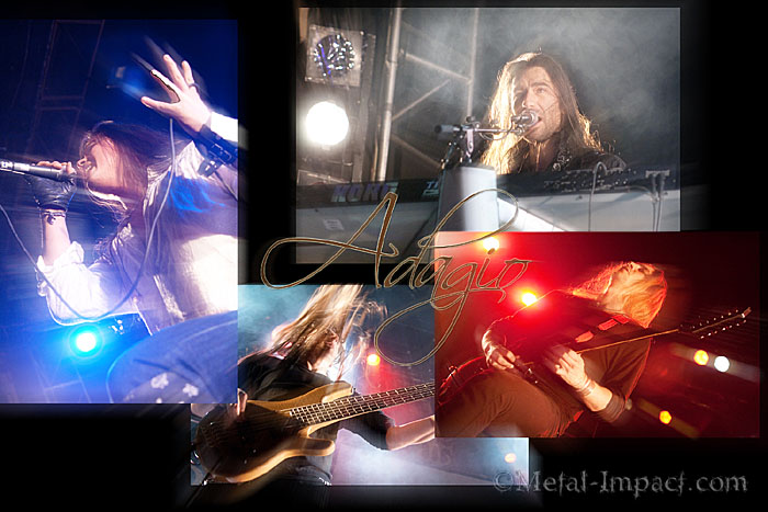 Un petit coucou à Roger en passant, et me voila en piste pour shooter dans d’excellentes conditions les deux morceaux d’ADAGIO pour lesquels j’ai l’autorisation. Le combo est ce soir très affuté et mordant, et a visiblement très envie d’en découdre avec une audience gavée de sons extrêmes. La part belle est faite – promo oblige – au dernier album, Archangels In Black, qui mérite amplement toutes les critiques dithyrambiques qu’il a suscitées. D’un petit groupe trop influencé par le Néo baroque et l’école Yngwie Malmsteen, ADAGIO est devenu une véritable machine de guerre implacable, mélangeant les styles et influences avec un brio incroyables. Capables dans le même morceau de mixer guitares sombres, chœurs Black, mélodies de chant aériennes, et parties de synthé atmosphériques, le quintette assure aussi visuellement, et l’énergie déployée ce soir n’avait rien de vaine, tant toute la salle a vibré d’un hommage commun. Hommage justifié, et j’attends de pied ferme de pouvoir les revoir sur un timing un peu moins serré.