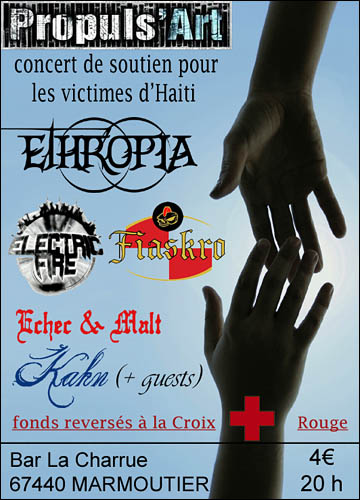 Il y’a des soirs comme ça, où l’on préfèrerait être chez soi, au chaud, vautré devant la télé avec une verveine-menthe. Ce fut le cas de ce week-end de février qui m’a contraint à faire le déplacement jusqu'à Marmoutier (Bas-Rhin) pour venir assister à ce concert dont je me serais volontiers passé. Pour une fois, ce genre de critique ne s’adresse pas aux groupes qui ont joué dans la salle de La Charrue. Les prestations n’étaient certes pas exceptionnelles mais ces quelques contre-performances artistiques n’avaient rien de comparable avec la dramatique cause qui nous réunissait tous ce soir-là. Pourtant, quelqu’un m’a dit que les métalleux avaient un cœur de pierre. Il faut alors croire que l’association Propuls’Art ne compte aucun vrai métalleux parmi ses rangs ou que mon interlocuteur était une personne mal renseignée. Car c’est bien la solidarité qui a réuni cheveux longs et moins longs le samedi 6 février 2010 autour d’une scène. Solidarité pour Haïti. En effet, très marqués par la tragédie qui frappa la partie ouest de l’île Hispaniola début janvier, les membres de l’association organisèrent à la hâte un concert de charité en soutien des victimes du tremblement de terre, les fonds récoltés étant intégralement reversés à la Croix-Rouge française. Cœur de pierre qu’il disait… Ceci étant, on aurait tous préféré ne jamais à avoir à organiser ce type d’évènement…