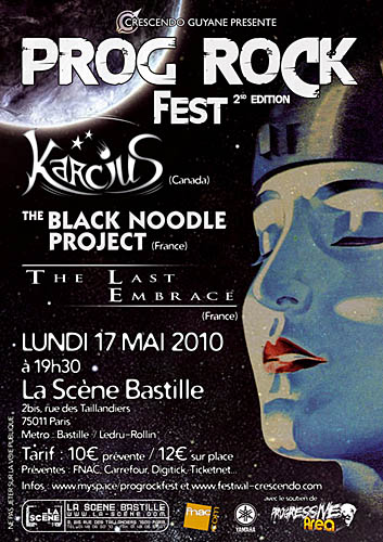 Belle initiative que ce Prog Rock Fest, dont la deuxième édition se tient ce soir à la Scène Bastille, avec pour tête d'affiche KARCIUS, un groupe québécois venu apporter à cette affiche un peu d'exotisme. Les autres groupes sont locaux, THE BLACK NOODLE PROJECT et THE LAST EMBRACE étant plutôt habitués aux joutes parisiennes.