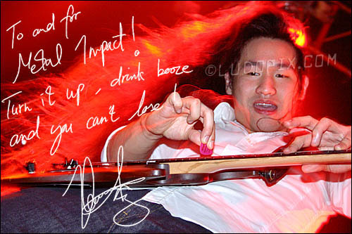Ils viennent en effet de signer chez Roadrunner Records, et en profitent pour nous présenter "Inhuman Rampage", avant de reprendre la route pour leur tournée européenne qui débutera en janvier 2006. Herman Li, le guitariste, répond gentiment à mes questions, mais malheureusement, il n'est pas très expansif. S'il parle volontiers de leurs inspirations musicales pour cet album, il est en revanche quasiment impossible de lui faire parler des textes de leurs chansons, de leur signification ou des thèmes abordés...