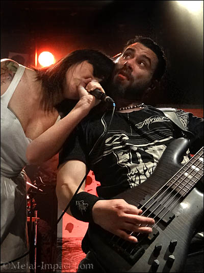Pat, en m’accueillant pour l’interview de KELLS en fin d’après-midi, m’avait fait part de quelques craintes par rapport au manque de temps pour optimiser techniquement leur set de ce soir. Il avait raison le gaillard. Au moins trente minutes on était nécessaire pour caler les derniers réglages du son. Suffisamment de temps pour casser la dynamique, la fluidité jusque-là observées dans l’enchaînement des groupes. De nombreux va-et-vient entre musiciens et techniciens. Laurent, le bassiste, ne perd pas son flegme : « Cool, mec, c’est ça le Rock’n’Roll ». Le set de KELLS sera légèrement raboté, mais pas saboté pour autant, pas le genre de la maison, trop respectueuse de son public. Nous aurons même ce soir le privilège d’écouter pour ainsi dire la quasi-totalité des titres du dernier album Anachromie, en ouvrant avec « Bleu », pour enchaîner sur « Se Taire » avec les grunts de Virginie contrastant avec son chant clair. Virginie, qui, d’entrée de jeu, va réchauffer la salle qui avait eu le temps de tiédir pendant les ultimes réglages, invitant les normands à se faire entendre, en dignes descendants des guerriers de la guerre de Cent Ans. Ce petit bout de femme, d’une courte robe blanche vêtue, bouscule l’image d’une Virginie virginale pour se révéler en Virgile dans sa toge virile à déclamer des poèmes néotériques.