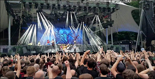 A la vue des réactions du public sur ces deux premières parties un peu poussives, on pourrait penser que les allemands n'ont pas beaucoup de jus dans le poireau. Il est vrai que l'assistance se compose de fans de la première heure et que l'âge moyen se situe dans la tranche 35 ans et plus. Les jeunes headbangueurs à longue crinière sont plutôt rares ce soir. Mais il s'avère bien vite que les 20.000 spectateurs ont choisi de concentrer leur énergie sur le clou du spectacle, car dès que retentissent les premières notes de "Doctor, Doctor", la chanson d'U.F.O qui annonce le début du set de la Vierge de Fer, tout le public se lève tel un seul homme pour acclamer ses héros.