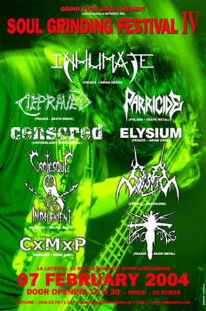Ca y est, c'est le jour J. ! Quatrième édition pour le festival Grind/Death devenu incontournable au fil des années. Et encore une fois l'affiche est des plus alléchante, jugez plutôt : Coitus, CxMxP, Solstis, Grotesque Impalement, Elysium, Censored, Parricide, Depraved et Inhumate. Et comme à l'accoutumée, le rendez-vous est fixé à la mythique salle "La Laiterie" ! Excellent tremplin donc pour tous les groupes participant de se faire connaître au plus grand nombre d'entre nous. Surtout que le SGF se veut avoir une programmation 100% Underground ! En gros, soit un groupe auto-produit ou signé sur un label indépendant, inutile donc de s'attendre à un No Mercy Part. 2, et c'est tant mieux !!!