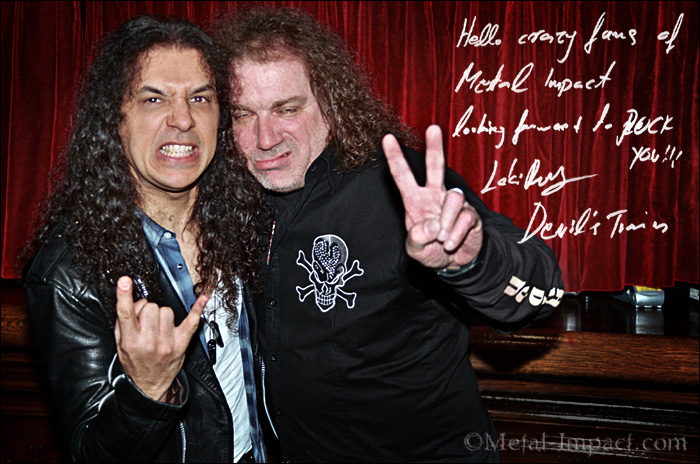 Alors que STRATOVARIUS semble au sommet de sa forme et vient tout juste de sortir un dvd live, Under Flaming Winter Skies, en l’honneur de Jörg Michael afin de célébrer ses seize années de bons et loyaux services au sein de la formation, notre teuton quant à lui ne semble pas décidé à prendre une retraite anticipée bien au contraire ! Le bougre est plus que polyvalent, non content d’être tour manager de nombreux gangs et pas des moindres, et de posséder une agence de promotion et d’organisation de concerts (Twisted Talents Agency), notre cogneur infernal revient derrière les futs à notre plus grand étonnement ! Car à peine a-t-il quitté le vaisseau amiral que le voilà de retour au sein d’un nouveau combo au nom évocateur : DEVIL’S TRAIN ! Une véritable bonne surprise quand on sait que tout au long de l’année le bougre avait communiqué sur son départ et son envie de passer à autre chose ! Une formation européenne puisqu’on y retrouve deux grecs, un allemand et un finlandais, plus cosmopolite que ça c’est rare !!! Si ce nouveau combo déboule à la vitesse lumière tel un météorite sur le devant de la scène sans avoir jamais fait parler de lui, à y regarder de plus prêt les lascars ne sont pas des novices et on déjà un sérieux background derrière eux ! Formé fin 2010, le train du diable regroupe en son sein une armada de vétérans qui a déjà écumé les scènes du monde entier et fait référence dans le petit monde métallique. En effet, le chanteur, Roberto Dimitri Liapakis (RD ou Lia pour les intimes) qui sévit au sein MYSTIC PROPHECY depuis de nombreuses années est l’initiateur de la naissance de cette nouvelle machine de guerre infernale. Pour le compte, il a su s’entourer d’une brochette de fines lames des plus efficaces, avec Jörg Michael à la batterie et Jari Kainulainen (STRATOVARIUS, EVERGREY) à la basse ! Un line-up prestigieux auquel vient se greffer un prodige de la guitare en la personne de Laki Ragazas. Avec une telle Dream Team et une pochette aussi typée Metal où trône le mythique signe du diable en forme d’étendard, on s’attend à une galette Power Metal des plus puissantes prête à vous provoquer un séisme cérébral irréversible ! Un aller simple en enfer sans passer par la case départ ! Que nenni, ici pas question de flammes et de petits démons mais une ambiance festive garantie. Rien que du bon rock’n’roll ultra efficace, taillé pour vous faire passer un bon moment accompagné d’une bonne pinte de bière à la main ! La surprise est de taille puisque le combo officie dans un style Blues Rock des plus efficace mais à mille lieux de tout ce qu’ils ont pu faire auparavant. Ici on est plutôt proche de BAD COMPANY, BADLANDS ou de BLUE MURDER pour notre plus grand plaisir, car les gaillards savent faire parler la poudre ! Devant un tel pédigrée de qualité, Metal Impact ne pouvait pas résister à la tentation d’aller tailler une petite bavette avec Jörg et Laki qui sont deux personnages très sympathiques ne cachant pas leur joie d’être de retour dans la capitale pour parler de leur nouveau bébé ! C’est à vous les garçons !