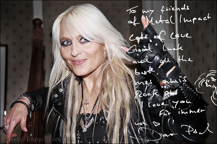DORO fait partie des légendes du Metal au même titre que Sieur Lemmy, une vraie référence pour tous ceux qui s’intéressent à notre musique préférée! Une déesse qui a gravé son nom au panthéon des icônes du Metal, une vraie référence incontournable !!! Il faut dire qu’elle fait partie de cette vague féminine qui a déferlé sur l’Europe au début des années 80 avec des combos comme GIRLSCHOOL, HELLION, THE RUNAWAYS, LITA FORD et a su s’imposer au fil du temps en ne déviant jamais d’un iota de sa ligne Métallique. Certains ont réussi à ne pas disparaitre ou faire un come back plus ou moins réussi. DORO, au même titre que MOTORHEAD, n’a jamais cessé d’exister et s’est battue constamment pour maintenir haut et fort l’étendard du Heavy Metal pur et dur et cela malgré les différentes vagues musicales qui ont déferlé au fil des années. Sa force, sa détermination infaillible et sa foi inébranlable lui ont très vite valu le surnom de Metal Queen. La tigresse a commencé à sévir dès 1980 avec SNAKEBITE mais c’est véritablement en 1982 que tout débute réellement avec WARLOCK, gang avec qui elle va graver quelques pépites incontournables comme Hellbound, True As Steel, ou encore Triumph Or Agony. S’en suivirent de nombreuse tournées dont certaines en ouverture de ses idoles de toujours comme JUDAS PRIEST ou encore DIO pour n’en citer que quelques unes. Ces gigs successifs lui permettront très vite d’acquérir une impressionnante réputation scénique grâce à ses performances vocales et un charisme hors du commun. ! Elle sera d’ailleurs la première femme à se produire sur la scène des MONSTERS OF ROCK de Donington en 1986 aux cotés de SCORPIONS, DEF LEPPARD OZZY OSBOURNE ou encore MOTORHEAD. A partir de ce moment, l’histoire est en marche. La machine DORO était lancée et n’allait jamais plus s’arrêter. La disparition de WARLOCK après quelques années de bons et loyaux services et autant de pépites lui donna l’opportunité de débuter une carrière solo exemplaire où la belle allait nous offrir quelques hymnes incontournables qui aujourd’hui font figure de classiques. Force Majeur ou bien encore DORO en 1990 produit par Mister Gene Simmons, ou d’ailleurs Thommy Thayer vient assurer des guitares auprès de notre belle teutonne, les albums s’enchainent et forcent le respect que du bon et même de l’excellent. Rien à jeter ! Que ce soit avec Warrior Soul (2006), ou bien encore Fear No Evil (2009) la qualité est au rendez vous et chaque opus contient plusieurs morceaux d’anthologie qui ne cessent de déambuler dans les méandres de votre mémoire pendant un bon moment. Raise Your Fist ne fait pas exception à la règle, bien au contraire. On assiste a un vrai déluge de feu, des grands morceaux typiquement Metal avec des moments d’émotions garantis, du grand art ! Il semblerait que notre blonde gagne en maturité au fils des années comme un bon vin qui vieillit tranquillement au fond d’une excellente cave ! Le temps ne semble pas avoir de prise sur elle, bien au contraire ! Une autre de ses forces c’est d’avoir toujours quelques invités de prestige sur pratiquement toutes les galettes, ce qui apporte réellement un plus ! Mais ce n’est pas tout, une de ses spécialités depuis le début des années 2000, c’est d’offrir sur chaque opus ou presque un duo avec une légende. Lemmy fut un des premiers à lui donner son appui sur deux titres de Calling The Wild ! Bien d’autres vinrent sévir par la suite sur différents titres comme Tarja, Peter Steele oui bien encore Udo ! Rencontrer la princesse Pesch fait partie de ces moments magiques qu’on ne peut pas oublier, un espace temps de bonheur qui vous tombe dessus tout d’un coup sans qu’on s’y attende. Car la belle est fidèle à sa réputation : adorable, dotée d’un enthousiasme inébranlable et toujours disponible à la moindre requête ! C’est évident, la Metal Queen c’est bien elle ! Et son titre n’est pas usurpé bien au contraire, elle aime ses fans et le Metal est une vraie religion pour elle, un sacerdoce qui la maintient au sommet depuis de nombreuses années pour notre plus grand plaisir ! En un mot la grande classe et son attitude, sa prestance rappellent sur bien des points celle de Ronnie James Dio dont elle reste une fan absolue ! MI ne pouvait pas louper une telle opportunité de tailler le bout de gras avec une telle légende et c’est avec un grand sourire que DORO a accueilli votre serviteur. Un entretien où l’on comprend aisément pourquoi on la surnomme la Reine du Metal ! C’est à toi DORO !
