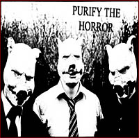 A propos d'effets, PURIFY THE HORROR en use de beaucoup. Ce trio constitué de figures bien connues de l'underground a choisi en premier lieu de se la jouer conceptuel, et d'arborer de splendides masques de cochons, "pour respecter l'esprit Grind originel". Soit. D'autres l'ont fait avant eux, et je ne peux d'ailleurs m'empêcher de dresser un parallèle avec les ineffables INTENSE MUTILATION, qui partageaient le même sens de la dérision, et la même tendance à brasser les courants pour devenir inclassables.