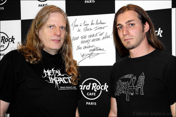 NIGHTMARE affiche depuis quelques années une forme resplendissante que rien ne semble pouvoir altérer. Il faut bien dire que depuis leur signature chez le label AFM, les choses semblent aller pour le mieux au sein du combo grenoblois. Le gang enchaine les albums à un rythme effréné et rien ne semble plus pouvoir les arrêter dans leur course folle. Deux après la sortie du remarquable The Burden Of God, nos amis sont de retour avec un nouveau méfait des plus efficaces. Le groupe, grâce à sa pugnacité, a réussi à s'imposer comme un des leaders de la scène française. Un survivant des années 80 qui n'est pas là pour faire de la figuration et connaît un succès nettement plus conséquent qu'à ses débuts. Il faut dire que les deux dernières années ont été extrêmement fructueuses grâces à une tournée au coté de CIRCLE II CIRCLE qui leur a permis de sillonner l'Europe toute entière. Et comme si cela ne suffisait pas, nos isérois se sont permis le luxe de jouer à Dubaï et de participer au mythique 70000 Tons Of Metal. Une véritable prouesse comparé aux autres formations qui peinent à transformer leur retour en sucess story malgré d'indéniables qualités. Cette fois-ci encore, NIGHTMARE n'a pas lésiné sur les moyens pour faire de The Aftermath une réussite totale. Exit les studios français et direction l'Allemagne, plus précisément Munich ou le combo s'est enfermé avec Mario Lochert (EMERGENCY GATE) pour enregistrer sa nouvelle galette avec pour objectif d'obtenir un son puissant axé principalement sur les guitares et nous délivrer des morceaux taillés pour la scène. Une opération concluante au vu de la qualité de leur nouvel opus qui nous offre sans conteste un Metal de grande classe et d'une redoutable efficacité. Un très bon cru qui ne peut que ravir tous les fans de NIGHTMARE. Afin d'en savoir un peu plus sur la genèse de The Aftermath, nous avons coincé Yves Campion au Hard Rock Café alors que la formation s'apprête à participer pour la troisième fois au célèbre Hellfest et sévira pour la quatrième fois au Wacken, de quoi rendre vert de jalousie bien des formations de l'hexagone. Rencontre avec un bassiste éreinté par de longues heures de transport mais toujours aussi loquace. Il revient nous éclairer en détails sur les deux dernières années très intense de NIGHTMARE...