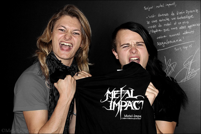 Il y a tout juste deux ans KISSIN' DYNAMITE, pour sa première incursion sur le territoire français, avait fait forte impression dans la petite sphère Metallique. Il faut dire que leur troisième méfait (Money, Sex and Power) avait par sa qualité intrinsèque marqué tous les esprits. Les teutons nous avaient en effet offert une véritable pépite de Sleaze Metal des plus efficaces qui leur avait permis de s'imposer comme un des leaders de la nouvelle scène Glam européenne. Fort de ce succès, ils s'embarquèrent aussitôt pour une tournée à travers le vieux continent aux côtés de DRAGONFORCE. Ce qui leur permis d'assoir leur réputation scénique en assurant des shows de haute volée devant un public qui ne leur était pas acquis d'avance, loin de là. Deux ans après la sortie de Money, Sex And Power, nos bavarois sont de retour avec un quatrième opus Megalomania qui risque de surprendre et même déstabiliser de nombreux fans ! Cette fois-ci, le gang a choisi de s'orienter vers un Hard Rock aux sonorités modernes teintées de nombreuses touches d'électro, un opus empreint d'une très forte personnalité. Ce changement d'orientation qui fait la part belle aux sonorités électroniques sur de nombreux morceaux serait une des conséquences de leur tournée japonaise où nos amis ont découvert un nouvel horizon musical en écumant les boites de nuits au pays du soleil levant. Une vraie prise de risque qui, au final, s'avère être une réussite totale. Megalomania regorgent de hits en puissance capable de vous retourner le cerveau en un rien de temps. Par sa diversité musicale, cette galette risque de toucher un public bien plus large et varié que ne l'avait fait Money, Sex And Power. Manifestement, le combo a choisi de s'émanciper de la famille Metal afin de s'assurer un avenir radieux et est en passe de s'imposer comme un groupe de premier plan sur la scène internationale ! Toutefois, si les KISSIN' DYNAMITE n'hésitent pas à se remettre en question musicalement malgré leur jeune âge, tout en conservant leurs racines profondément ancré dans les eighties, ils n'ont heureusement pas perdu leur énergie et leur joie de vivre, une des facettes de leur personnalité qui leur colle à la peau depuis leurs débuts. Devant une telle métamorphose, MI se devait d'en savoir un peu plus sur le pourquoi et le comment de cette mutation radicale ! Rendez-vous était pris dans un hôtel parisien avec Hannes Braun et Jim Muller, respectivement chanteur et guitariste de KISSIN' DYNAMITE, afin d'élucider le mystère de cette transformation fondamentale. Un changement de cap important pour nos anciens Glamers qui risque de faire couler beaucoup d'encre au sein de la communauté Metal ! Entretien avec deux joyeux lurons maniant le second degré avec dextérité et de façon intensive, une acrobatie verbale que Hannes Braun maitrise à la perfection ! Vous avez dit mégalomaniaque ? Magnéto les gars, c'est à vous !