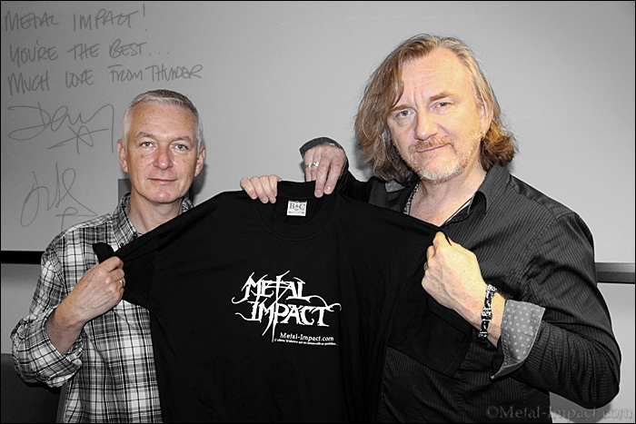 THUNDER est un gang qui nous vient de la perfide Albion et s'est formé en 1989 ! 27 ans de bons et loyaux services avec comme seul étendard : un Hard Rock Bluesy de grande classe très British ! Et quand on sait que le duo Luke Morley et Danny Bowes avait déjà derrière eux une longue expérience au sein de TERRAPLANE (l'ancêtre de THUNDER), on ne peut qu'être admiratif devant ce long parcours au service du Rock'n'roll dû a une passion indéfectible. Unis pour le meilleur et pour le pire, ils ont su faire de THUNDER un groupe sur lequel il faut compter et qui a su s'imposer au fil des années comme une valeur sure. Leur parcours à démarrer d'une façon exceptionnel qui ferait fantasmer n'importe quel combo de nos jours. Imaginer une formation qui signe sur une maison de disque internationale (EMI) dès leur premier opus Backstreet Symphony produit par Andy Taylor de surcroit un must qui semble venu d'une autre galaxie ! Le combo enchainera les albums et les tournées s'offrant le luxe d'ouvrir pour des monstres sacrés comme BON JOVI, DEF LEPPARD ou encore WHITESNAKE. Malgré leurs efforts et la qualité de leurs prestations, le succès ne sera pas vraiment au rendez-vous excepté en Angleterre ou la formation squattera les charts de nombreuses fois ! Ils enchaineront par une multitude d'opus et de live tous d'excellente facture qui a fait la joie d'un cercle de fans indéfectibles. Après plusieurs séparations une en 2002 et une autre en 2009 permettant à Luke et Danny de poursuivre une carrière solo, nos britishs ont décidé une fois de plus de remettre le couvert et nous reviennent avec Wonder Days redoutable opus dans un style reconnaissable instantanément ! Il faut dire que THUNDER n'a jamais succombé aux modes musicales et est toujours resté fidèles a ses racines. Pour en savoir un peu plus sur ce nouveau come-back, votre serviteur a passé au gril les deux membres fondateurs de THUNDER, Danny Bowes et Luke Morley ! Une histoire qui débute en 1975 sur les bancs de l'école et qui a permis à deux kids de se retrouver sur les plus prestigieuses scènes européennes ! Petit retour en arrière avec deux musiciens sympathiques, bourrés d'humour et franchement heureux de venir défendre leur petit dernier à Paris. Magnéto les gars, c'est à vous !