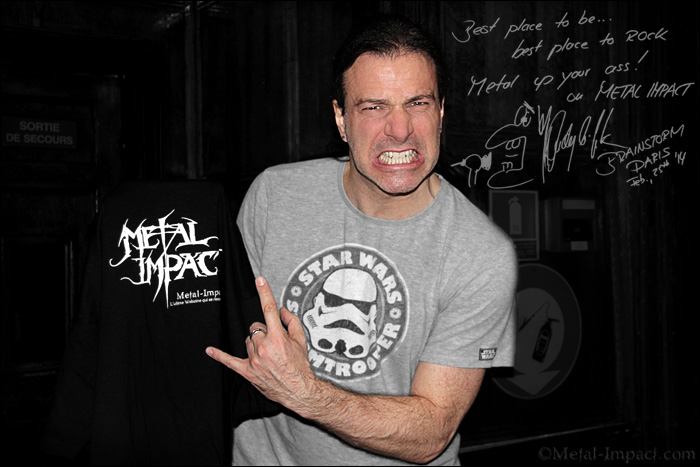 Andy B. Frank est un personnage original, toujours de bonne humeur, il n'a jamais cessé de défendre le Heavy Metal corps et âme quels que soient les écueils qu'il a rencontré ! S'il a débuté en 1998 au sein de SYMPHORCE ; depuis 2011, le bougre déploie toute son énergie au service de BRAINSTORM son deuxième groupe. Depuis la sortie On The Spur Of The Moment notre teuton et son gang semble surfer sur un petit nuage et on sillonné l'Europe de long en large afin d'imposer leur Power Metal. Si le gang s'est formé en 1989, Andy les rejoints dix ans plus tard. Son arrivée sera un véritable détonateur qui va permettre à la formation teutonne de prendre son envol et d'aligner les galettes à une vitesse vertigineuse, l'inspiration étant au rendez-vous. Ce n'est pas moins de trois albums qui sortiront en l'espace de trois ans et pas des moindre Ambiguity, Metus Mortis et Soul Temptation. Trois pépites de pur Power Metal qui vous explosent les neurones en un temps record. Downburts et Memorial Roots marqueront une évolution dans la carrière de BRAINSTORM qui verra le combo s'orienter vers un Metal plus ambitieux ! Dans cette optique, ils confieront la production à Sasha Peath et Miro (Mickael Rosenberg) qui ont travaillé avec RHAPSODY, AVANTASIA, EDGUY ou encore EPICA. Cette nouvelle orientation musicale ne sera pas du goût de tout le monde et déstabilisera les fans les plus assidus. Conscient que l'expérience n'était pas une franche réussite aux yeux de tous, Andy et ses acolytes décidèrent alors de redresser la barre au plus vite avant que le vaisseau ne s'échoue définitivement. C'est avec On The Spur Of The Moment que la formation effectuera un retour aux sources qui ne sera pas totalement convaincant car le manque d'inspiration se faisant ressentir sur de nombreux morceaux. Si artistiquement la tentative n'as pas été totalement concluante, elle leur permettra tout de même de tourner intensivement à travers le monde. Trois ans plus tard, BRAINSTORM déboule avec Firesoul sous le bras, un nouvel opus de très bonne facture nettement plus fougueux et destiné à reconquérir le statut qu'ils n'auraient jamais dû perdre. Ce nouveau méfait métallique à souhait semble être là pour remettre enfin les pendules à l'heure ! Le leader de BRAINSTORM en est convaincu : Firesoul symbolise une vraie renaissance qui va lui permettre de reconquérir ses fans les plus Hardcore ! C'est un Andy B. Frank en pleine forme que votre serviteur a rencontré au Hard Rock Café dans une ambiance des plus conviviale ! Entretien avec un musicien éminemment sympathique, très heureux d'être à Paris et très fier d'assurer la promotion de son petit dernier Firesoul ! Magnéto Andy, c'est à toi !