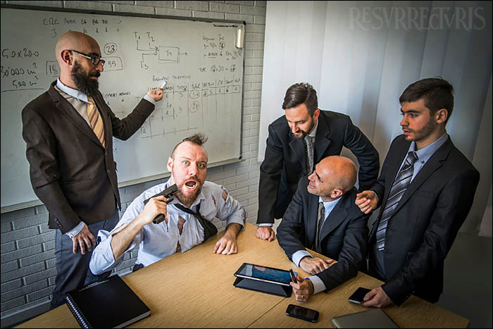 D'ailleurs, ça ressemblait plus à de la cinématographie qu'à de la musique... Lorsque Enrico enregistrait ses parties de chant, je ne lui disais pas "fais le à la Chris Barnes" ou des trucs dans le genre, non, c'était plutôt "imagine toi en pleine réunion avec les dirigeants, un truc bien tendu. Comment les enverrais tu paître si tu le pouvais ?", tu vois le genre ? Des années après le coaching d'acteur, on a inventé le coaching de chanteur ! [Rires] On a vécu un moment incroyable en enregistrant le chant de "Col-League-s". On voulait de vrais voix d'employés de bureau pour ce morceau, alors on a embarqué des amis et des collègues pour qu'ils crachent leurs tripes ! Ils ne sont pas musiciens, mais leur spontanéité a donne corps au morceau.