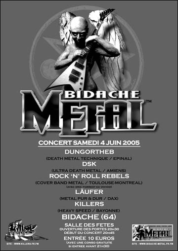 Groupes Présents au concert : KILLERS (heavy speed / Bayonne), LAUFER (Metal pur et dur / Dax), ROCK’N ROLL REBELS (Cover band metal / Montreal – Toulouse), DSK ( Ultra death metal / Amiens), DUNGORTHEB ( death technique / Epinal)
